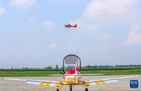 8月24日,在位于山東萊西市店埠鎮(zhèn)的青島萊西通航產(chǎn)業(yè)園,飛行愛好者駕駛輕型運(yùn)動(dòng)飛機(jī)。